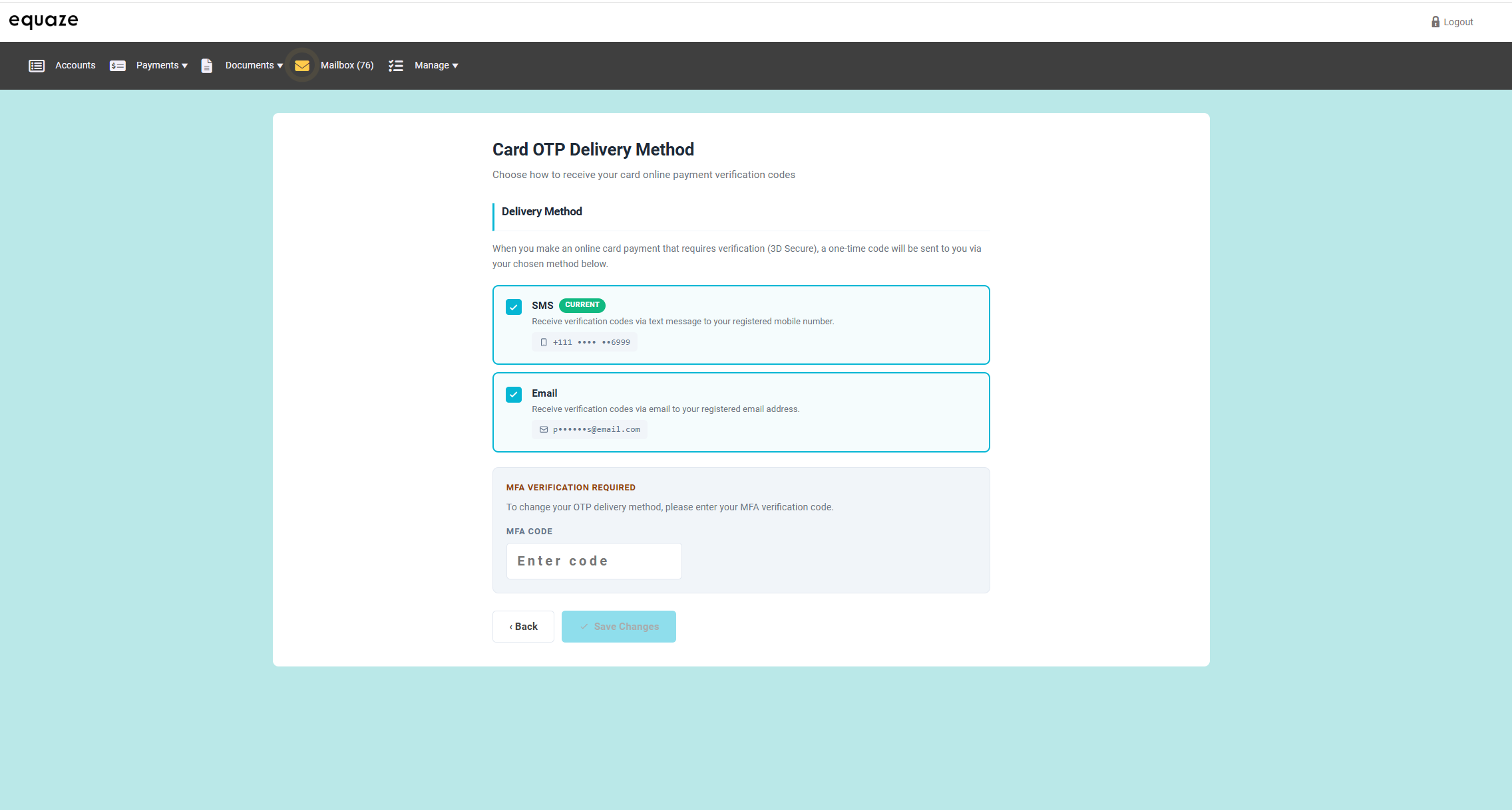 Step 2: The user can select SMS, Email, or both as the delivery method. After selecting the method, the system displays the MFA input field.