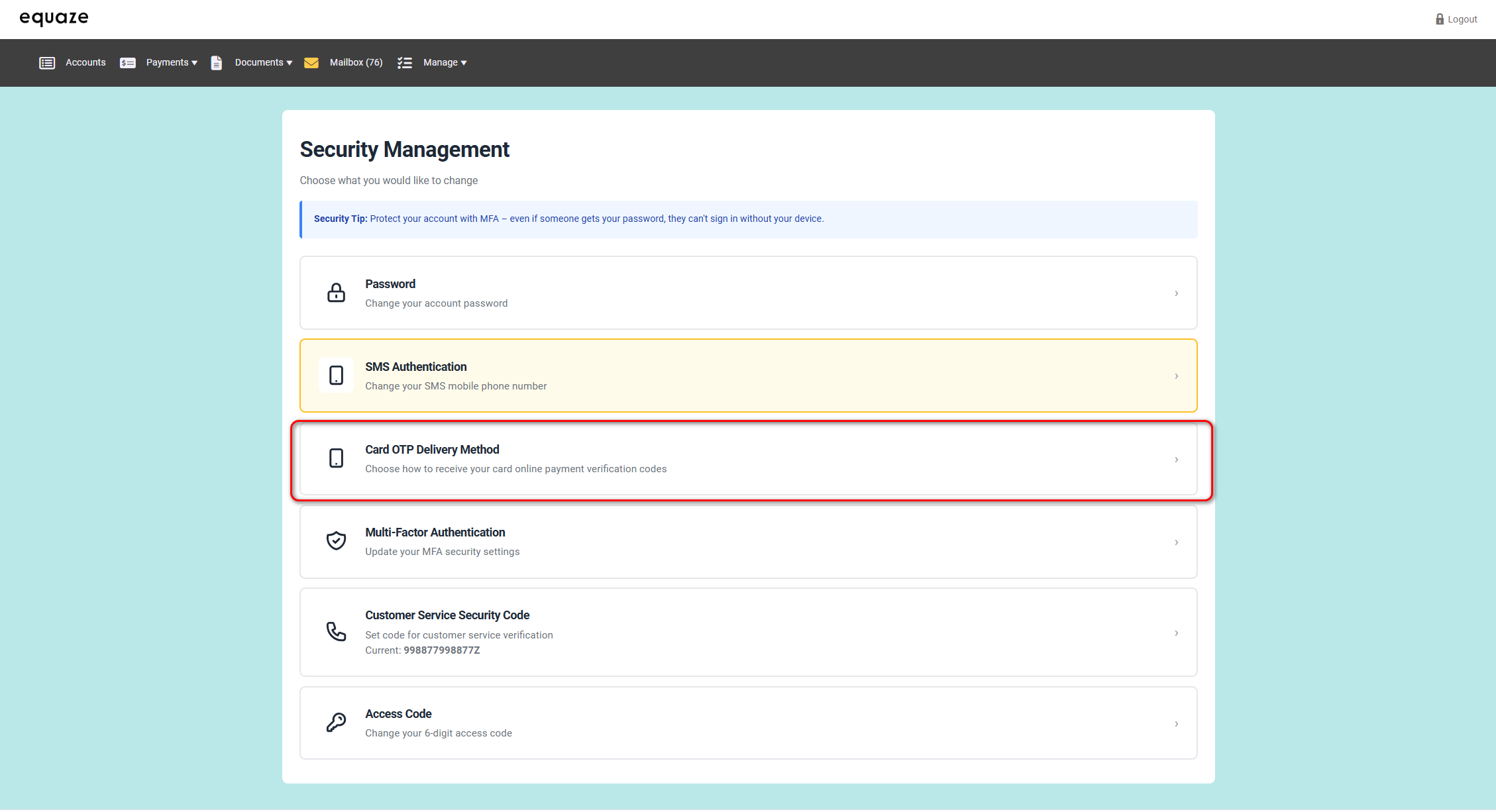 On Security Management page, click on Card OTP Delivery Method to view its details.