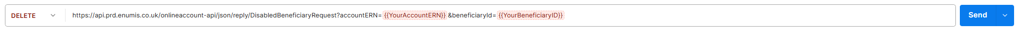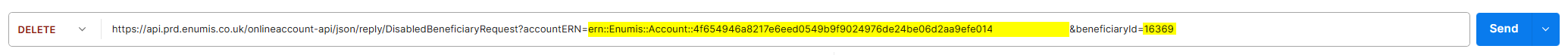 Replace “YourAccountERN” with your actual AccountERN and “YourBeneficiaryId” with the BeneficiaryID of the beneficiary you want to delete then click on “Send” button.