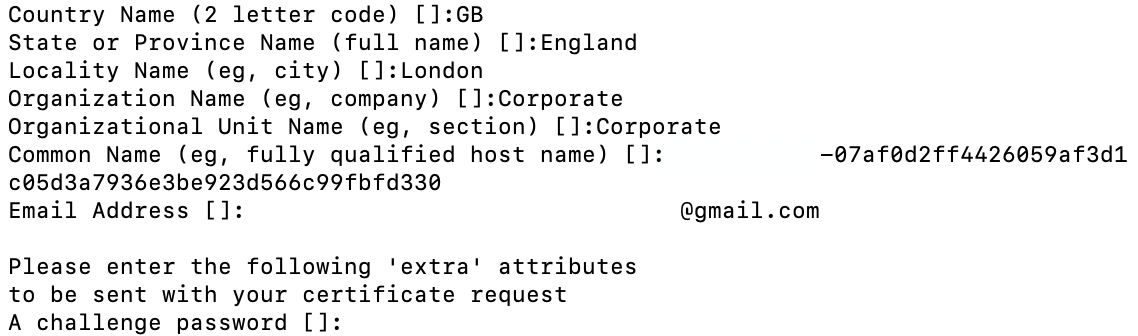 - The Terminal will prompt you to provide information for the certificate. This information will be embedded in the certificate, so answer accurately.