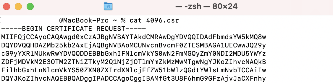 Then cat 4096.csr to inspect the contents of the CSR. This file is public, but it doesn’t compromise your private key.